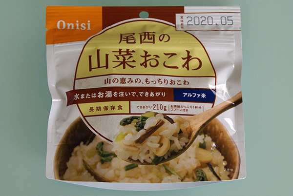 アルファ米の製品には、数十人分を一度に作る避難所向けのものと、1食分ずつ梱包された家庭向けのものがあります。ここでは家庭向けのアルファ米「山菜おこわ」を作ります。